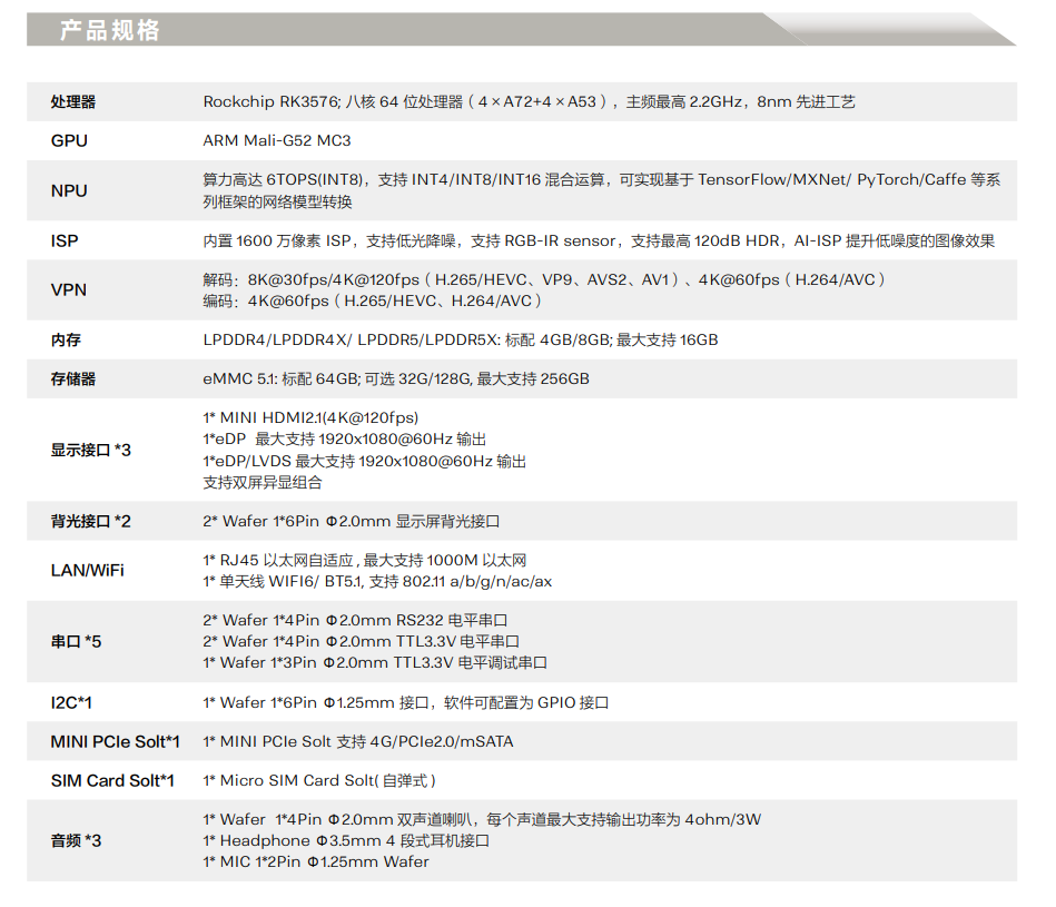 ? 集成 GPU/VPU/NPU 協處理器 :OpenGL ES3.2 /2.0,Vulkan1.1、8K@30fps H.265 /VP9 視頻解碼、4K@60fps H.265/H.264 視頻編碼、6TOPS 算力 NPU
